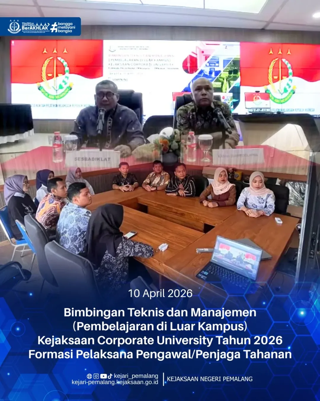 Jumat, 10 April 2026 - Kejaksaan Negeri Pemalang mengikuti kegiatan Bimbingan Teknis dan Manajemen (Pembelajaran di Luar Kampus) Kejaksaan Corporate University Tahun 2026 bagi Formasi Pelaksana Pengawal/Penjaga Tahanan