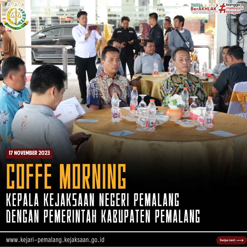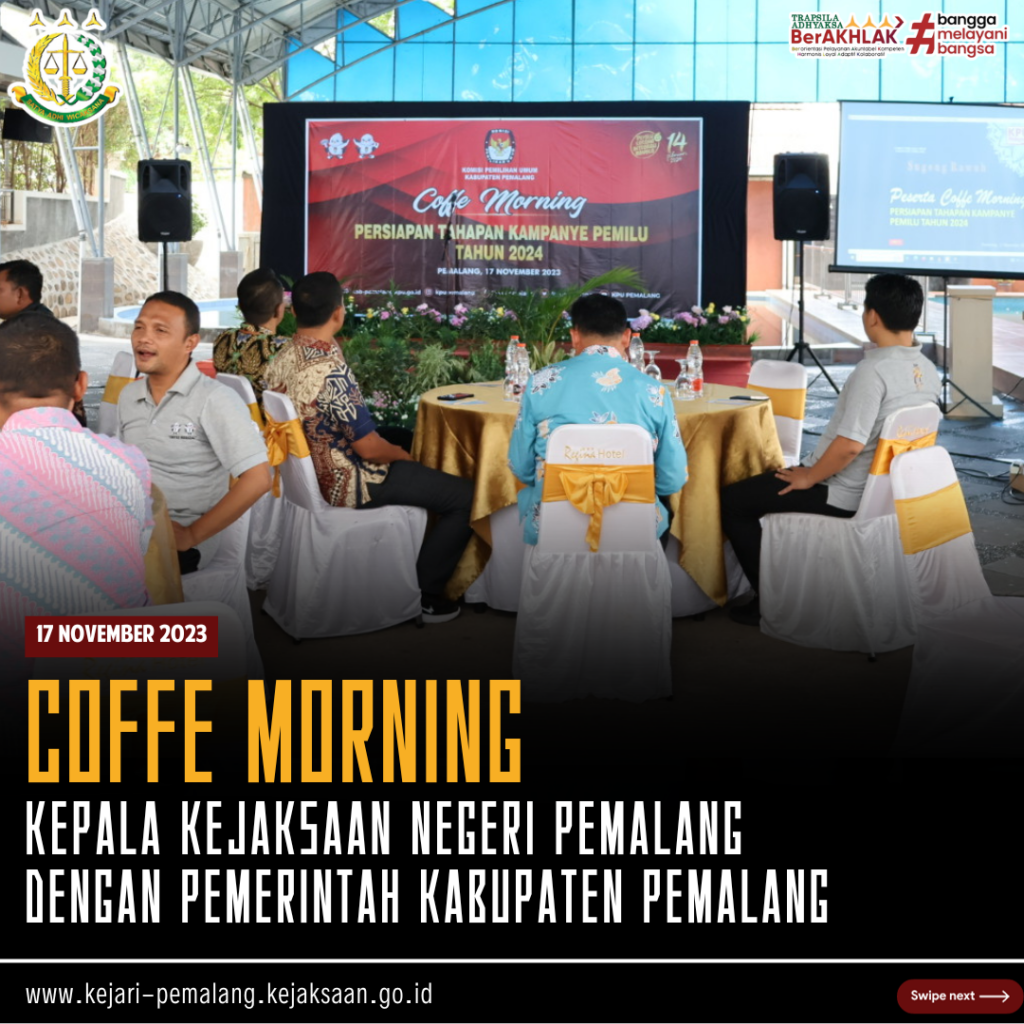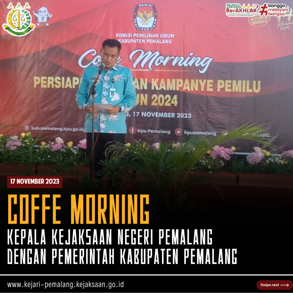 Kepala Kejaksaan Negeri Pemalang Muib, s.H., M. H.Li menghadiri Giat Coffe Morning Pemkab Pemalang yang di isi Pengarahan Bupati Pemalang terkait persiapan tahapan kampanye pemilu tahun 2024Kabupaten Pemalang.