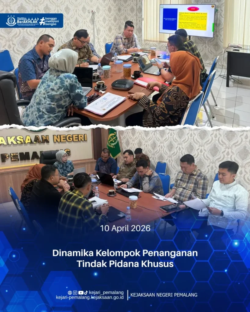 Jumat, 10 April 2026. Kepala Kejaksaan Negeri Pemalang Ibu Rina Idawani, S.H., CN., M.M. beserta Para Kepala Seksi dan Kasubsi melaksanakan Kegiatan Dinamika Kelompok Penanganan Tindak Pidana Khusus, Bertempat di Ruang Vicon Kejaksaan Negeri Pemalang