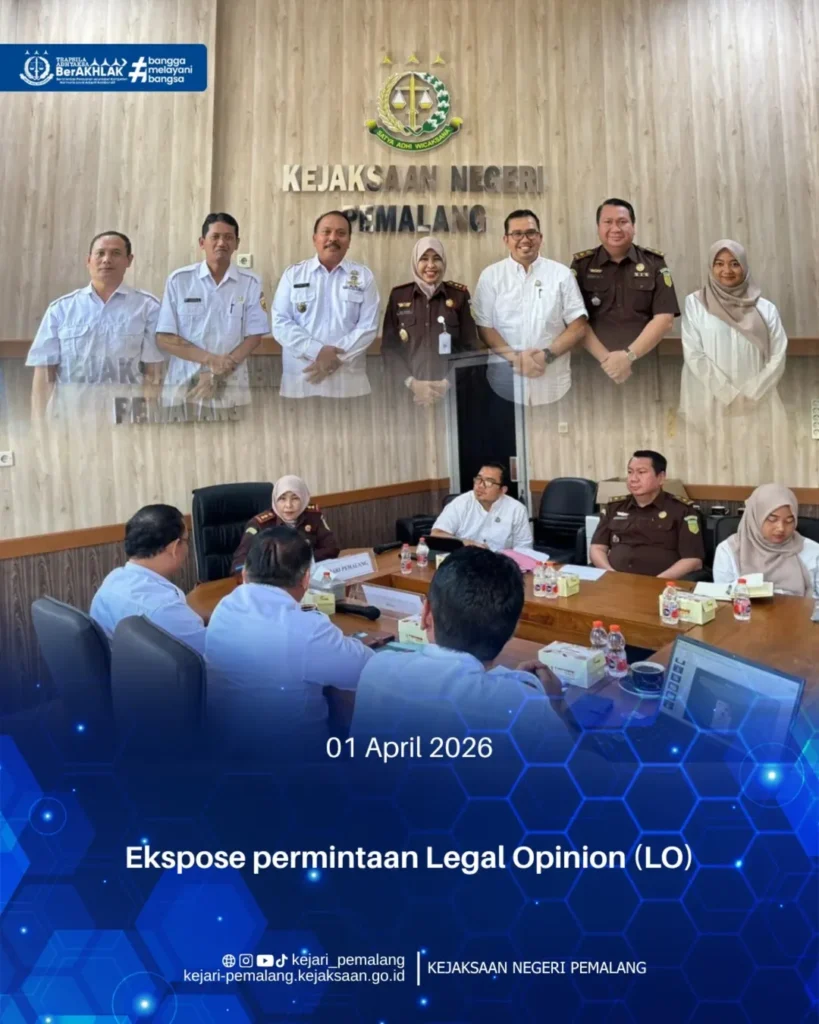 Rabu, 1 April 2026, Kepala Kejaksaan Negeri Pemalang Ibu Rina Idawani, S.H., CN., M.M. didampingi Kepala Seksi Perdata dan Tata Usaha Negara Bapak Muhammad Syarief Simatupang, S.H. serta Kepala Seksi Tindak Pidana Umum Bapak Stirman Eka Priya Samudra, S.H., M.H. melaksanakan ekspose permintaan Legal Opinion (LO) Desa Kalirandu, Kecamatan Petarukan terkait sewa menyewa TKD yang bertempat di Kantor Kejaksaan Negeri Pemalang.