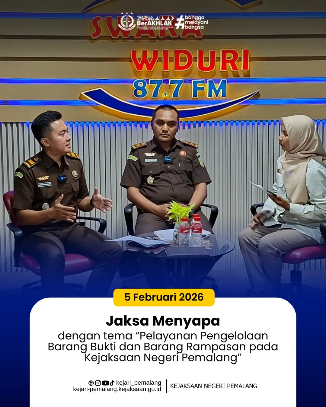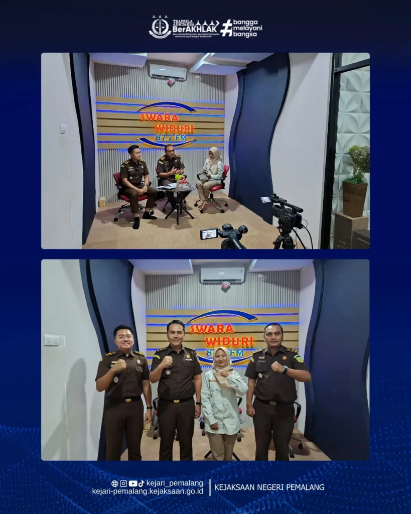 Kejaksaan Negeri Pemalang hadir melalui program Jaksa Menyapa di LPPL Radio Swara Widuri, Kamis 5 Februari 2026. Bersama host Tyas Alodie, juga narasumber Irfan Harisman, S.H., M.H. selaku Kepala Seksi Seksi Pemulihan Aset dan Pengelolaan Barang Bukti, dan Aditya Krisdamara, S.H., M.H. selaku Kepala Subseksi I Intelijen.