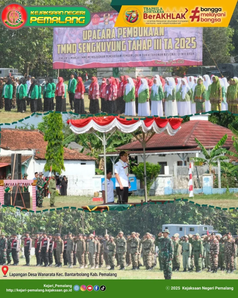 Pemalang, 23 Juli 2025 – Kepala Kejaksaan Negeri (Kajari) Pemalang, Muib, S.H., M.H.Li, menghadiri Upacara Pembukaan TNI Manunggal Membangun Desa (TMMD) Sengkuyung Tahap III Tahun Anggaran 2025 yang digelar Kodim 0711/Pemalang di Desa Wanarata, Kecamatan Bantarbolang. Upacara dipimpin oleh Sekretaris Daerah Kabupaten Pemalang, Heriyanto, S.Pd., M.Si., dengan diikuti sekitar 600 peserta dari unsur TNI, Polri, Forkopimda, OPD, serta masyarakat setempat.