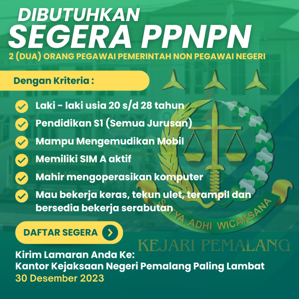 Kejaksaan Negeri Pemalang membuka lowongan kerja Pegawai Pemerintah Non Pegawai Negeri (PPNPN) Tahun 2024 dengan kriteria dan ketentuan dalam postingan. Ayo buruan daftarkan diri anda sebelum tanggal 30 Desember 2023.