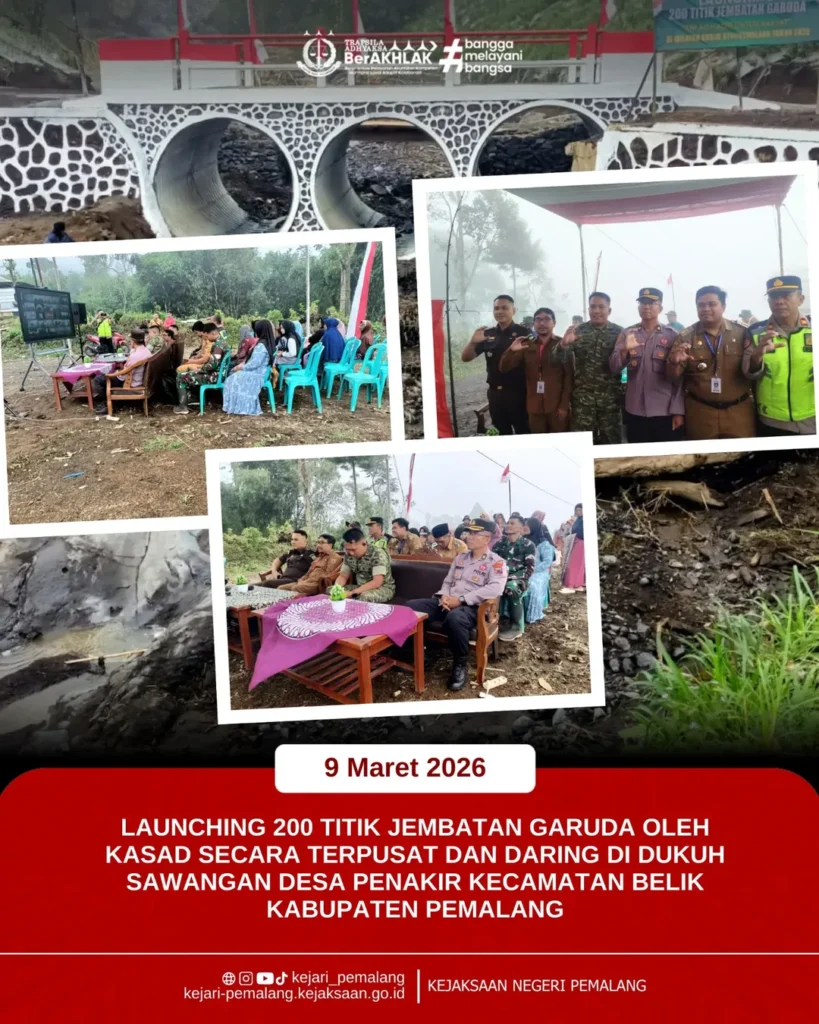 Pada hari Senin tanggal 9 Maret 2026 pukul 14.00 s.d 15.00 WIB bertempat di Dusun Sawangan Desa Penakir Kec. Pulosari Kab. Pemalang , Kepala Seksi Intelijen Bapak. Akhmad Rafliansyah Pasra, S.H., M.H. menghadiri Kegiatan Launching 200 titik Jembatan Garuda oleh Kasad secara terpusat dan Daring. Melalui program Jembatan Garuda ini, TNI AD ingin memastikan akses masyarakat semakin mudah sehingga dapat meningkatkan kesejahteraan warga. Jembatan ini sangat membantu masyarakat. Warga Desa Penakir pun tampak antusias menyambut peresmian ini. Jembatan tersebut diharapkan mempermudah aktivitas ekonomi, pendidikan, dan pelayanan masyarakat antarwilayah di Kecamatan Pulosari, sekaligus mendorong pertumbuhan ekonomi Kabupaten Pemalang