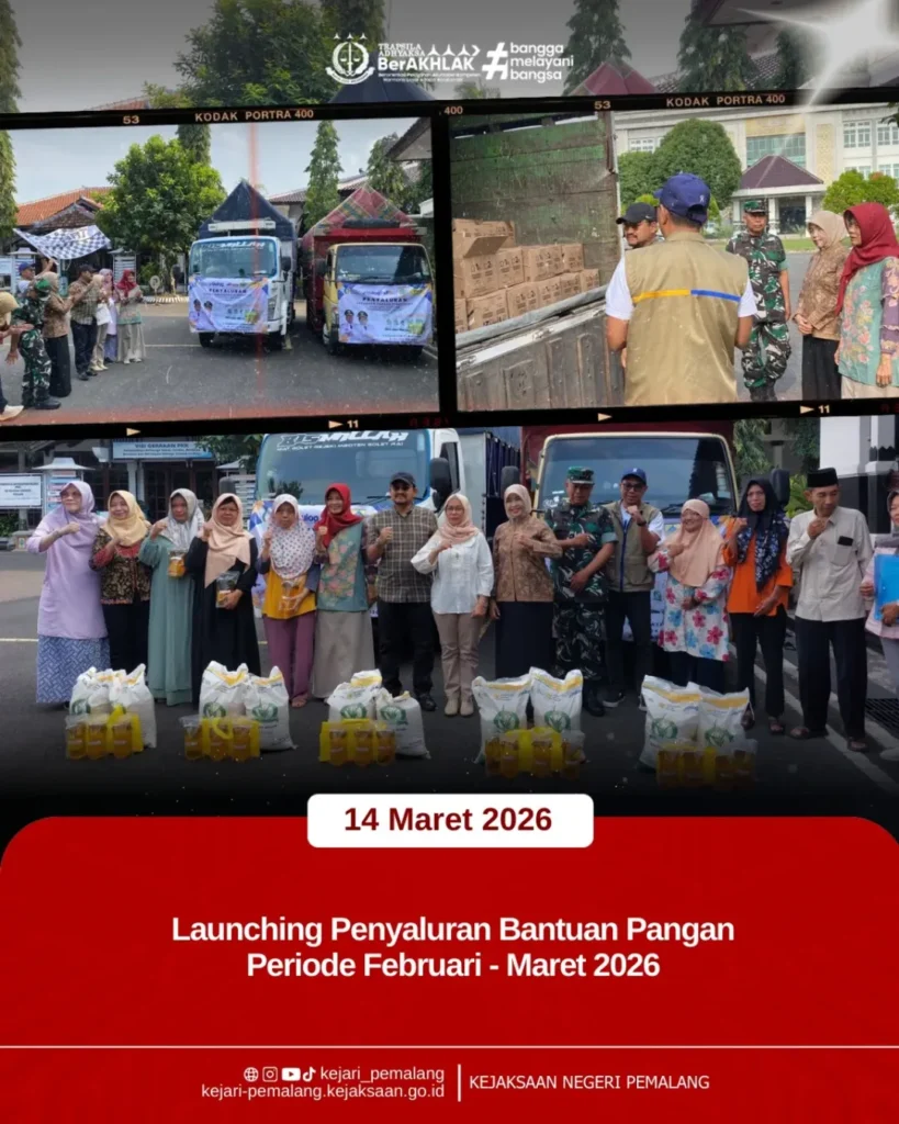 Kepala Kejaksaan Negeri Pemalang Ibu Rina Idawani, S.H., CN., M.M. menghadiri kegiatan Launching Penyaluran Bantuan Pangan Periode Februari–Maret 2026 yang dilaksanakan pada Sabtu, 14 Maret 2026 di halaman Pendopo Kabupaten Pemalang. Kegiatan tersebut merupakan program pemerintah pusat melalui Bulog Tegal yang disalurkan kepada Pemerintah Daerah Kabupaten Pemalang sebagai bentuk dukungan dalam menjaga ketersediaan dan keterjangkauan bahan pangan bagi masyarakat. Kegiatan ini turut dihadiri oleh Bupati Pemalang Bapak Anom Widiyantoro, S.E., M.M., perwakilan unsur Forkopimda, Kepala Cabang Bulog Tegal beserta jajaran, serta beberapa kepala OPD di lingkungan Pemerintah Kabupaten Pemalang.