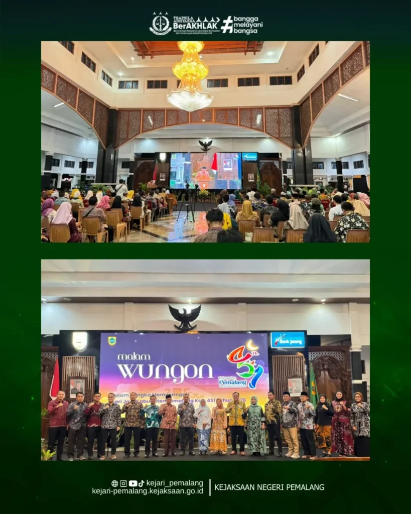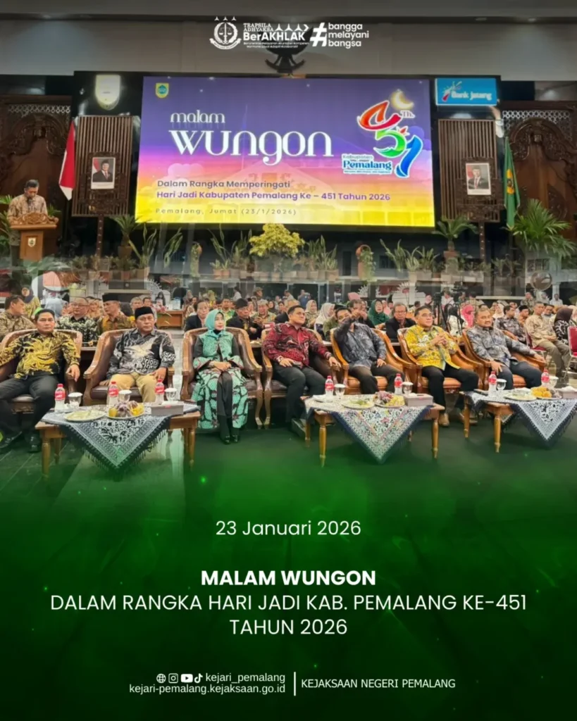 Kepala Kejaksaan Negeri Pemalang Ibu Rina Idawani, S.H., CN., M.M. menghadiri kegiatan Malam Wungon dalam rangka Peringatan Hari Jadi ke-451 Kabupaten Pemalang Tahun 2026 yang dilaksanakan pada Jumat, 23 Januari 2026, bertempat di Pendopo Kabupaten Pemalang dengan tema “Menyala, Bercahaya, dan Sejahtera.” Kegiatan berlangsung khidmat sebagai wujud rasa syukur atas perjalanan panjang Kabupaten Pemalang.