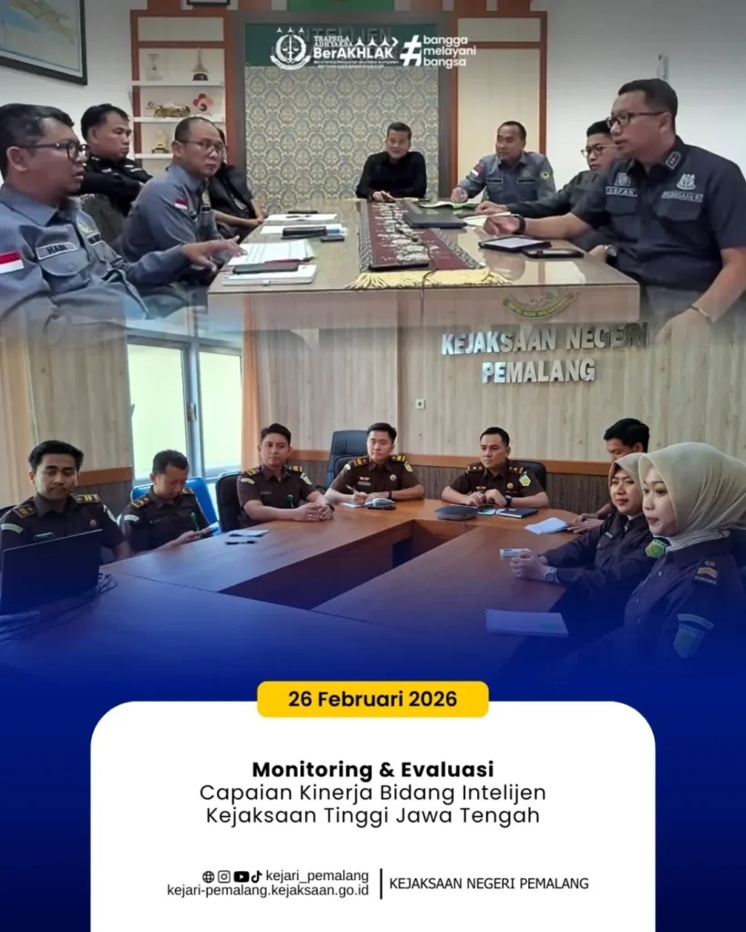 Kamis, 26 Februari 2026, Kepala Seksi Intelijen Kejaksaan Negeri Pemalang Akhmad Rafliansyah Pasra, S.H., M.H. beserta jajaran Intelijen Kejaksaan Negeri Pemalang mengikuti kegiatan Monitoring & Evaluasi (Monev) Capaian Kinerja Bidang Intelijen Kejaksaan Tinggi Jawa Tengah yang dilaksanakan secara daring.