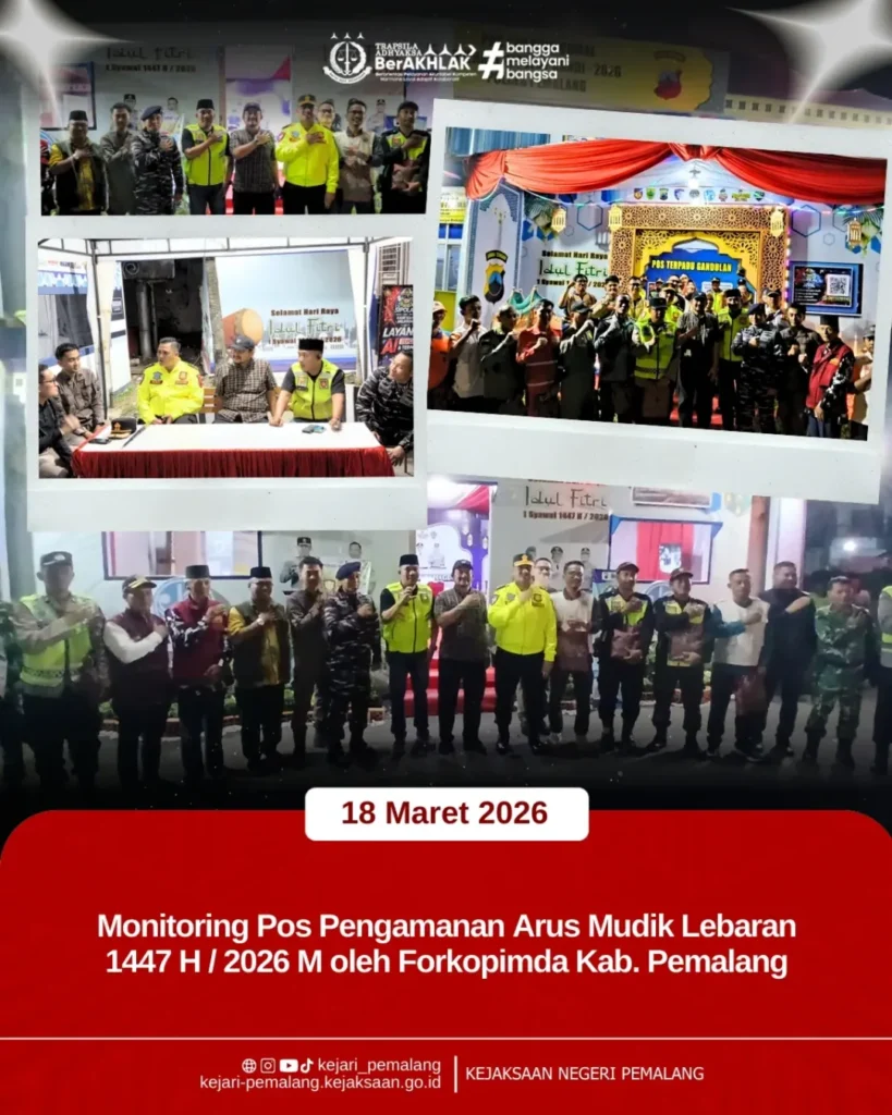 Kejaksaan Negeri Pemalang turut hadir dalam kegiatan Monitoring Pos Pengamanan Arus Mudik Lebaran 1447 H / 2026 M yang dilaksanakan pada Rabu, 18 Maret 2026. Kegiatan ini merupakan bentuk sinergi Forkopimda Kabupaten Pemalang dalam memastikan keamanan, kelancaran, dan kenyamanan masyarakat selama arus mudik Lebaran. Rombongan Forkopimda melakukan peninjauan ke sejumlah pos pengamanan, di antaranya Pos Alun-Alun Pemalang, Pos Pantura Pagaran, Pos Blandong Comal, hingga Pos Terpadu Gandulan. Kegiatan monitoring ini bertujuan untuk memastikan kesiapan pos pengamanan serta optimalisasi pelayanan kepada masyarakat selama arus mudik Lebaran