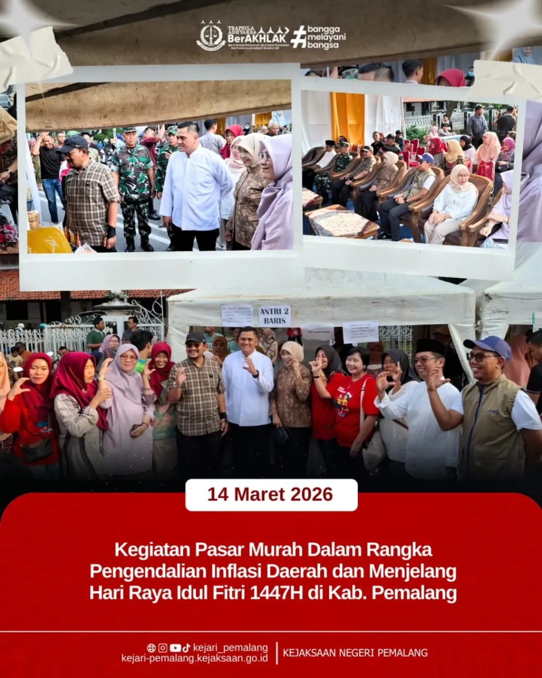 Kepala Kejaksaan Negeri Pemalang Ibu Rina Idawani, S.H., CN., M.M. menghadiri kegiatan Pasar Murah dalam rangka Pengendalian Inflasi Daerah dan menjelang Hari Raya Idul Fitri 1447H yang diselenggarakan oleh Pemerintah Kabupaten Pemalang melalui Dinas Koperasi, Usaha Kecil Menengah, Perindustrian dan Perdagangan (Diskumdag), pada Sabtu (14/03/2026) bertempat di halaman parkir Pendopo Kabupaten Pemalang. Kegiatan ini turut dihadiri oleh Bupati Pemalang, Kapolres Pemalang, unsur Forkopimda, kepala OPD, serta masyarakat yang antusias memanfaatkan kesempatan untuk memperoleh kebutuhan pokok dengan harga terjangkau