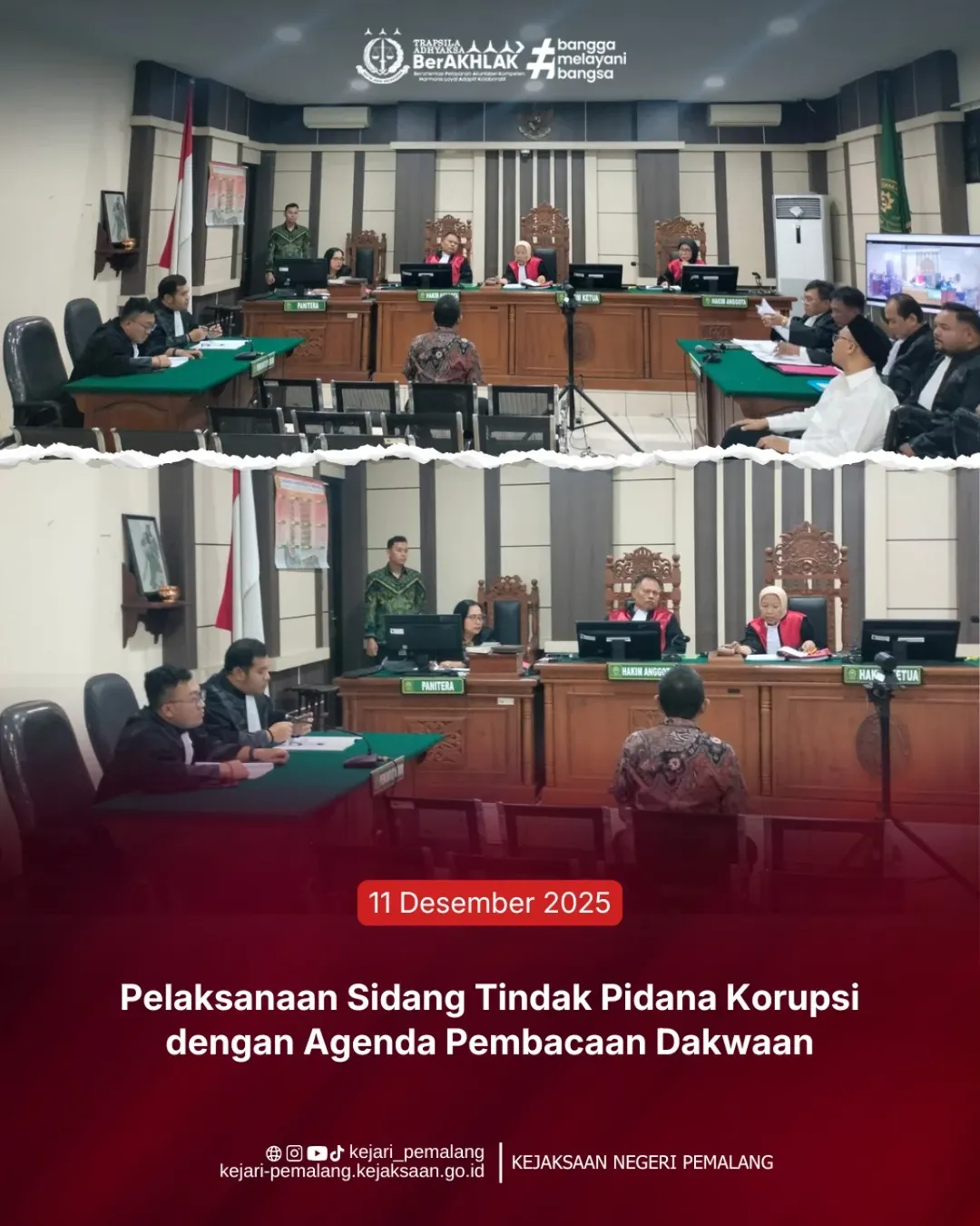 Pada hari Kamis, tanggal 11 Desember 2025, bertempat di Pengadilan Tindak Pidana Korupsi Pada Pengadilan Negeri Semarang, telah dilaksanakan Kegiatan Sidang dengan Agenda Pembacaan Dakwaan atas Dugaan Perkara Tindak Pidana Korupsi Penyimpangan/Penyalahgunaan Keuangan Penyertaan Modal Kabupaten Pemalang (Perseroda) tahun 2021 sampai dengan tahun 2023 dengan Terdakwa a.n EHK dan A.