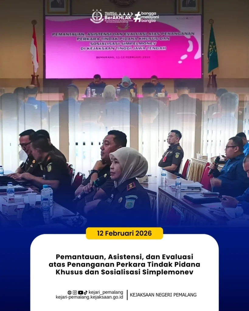 Kamis, 12 Februari 2026, bertempat di Aula Imam Bardjo Lantai 4 Kantor Kejaksaan Tinggi Jawa Tengah, telah dilaksanakan kegiatan Pemantauan, Asistensi, dan Evaluasi atas Penanganan Perkara Tindak Pidana Khusus serta Sosialisasi Simplemonev.