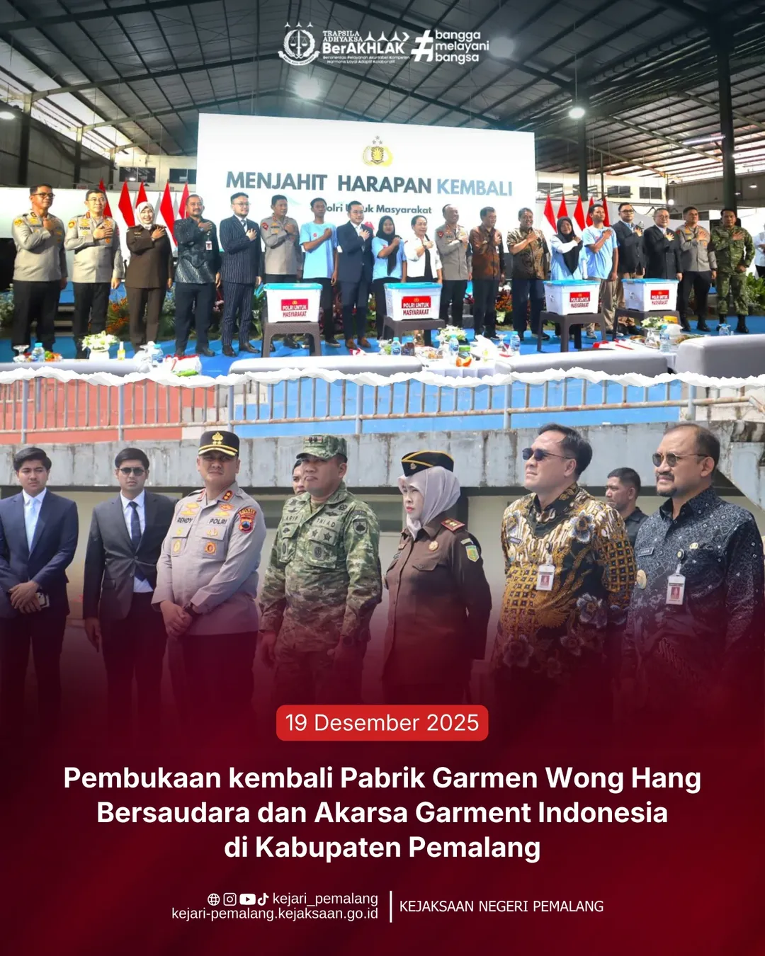 Pada hari jum’at tanggal 19 Desember 2025, Ibu. Rina Idawani, S.H., CN., M.M selaku Kepala Kejaksaan Negeri pemalang menghadiri kegiatan Pembukaan kembali Pabrik Garmen Wong Hang Bersaudara dan Akarsa Garment Indonesia bertempat di Jl. Lingkar luar kelurahan Beji kec Taman, Kab. Pemalang yang dibuka langsung oleh Komjen Pol. Prof. Dr. Dedi Prasetyo, S.H., M.Hum., M.Si., M.M., (Wakapolri). Kegiatan dihadiri juga oleh Anggota Forkopimda Kabupaten Pemalang.