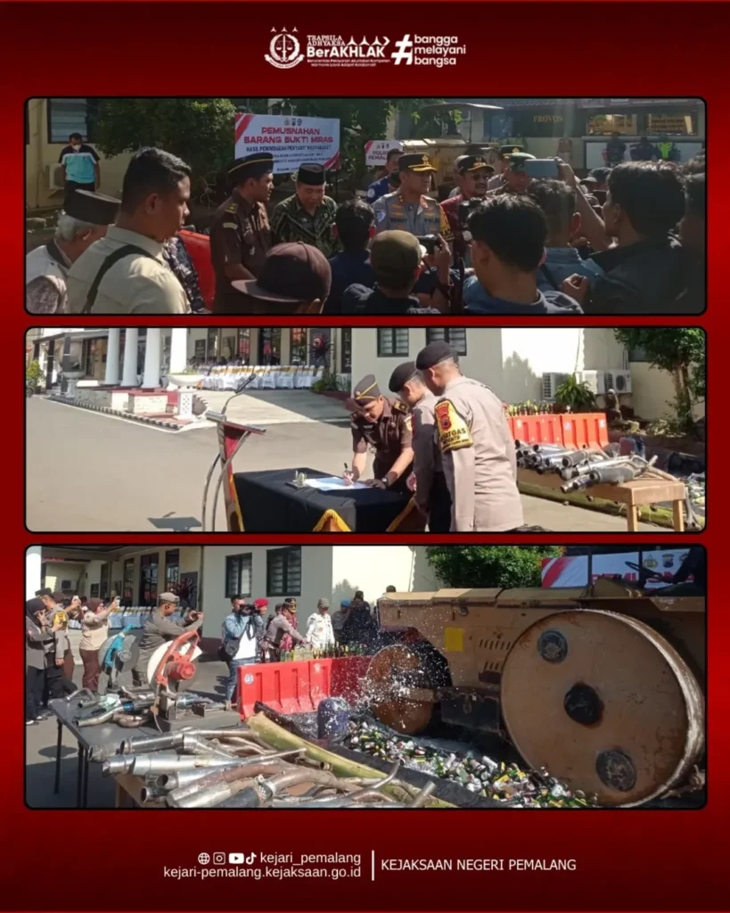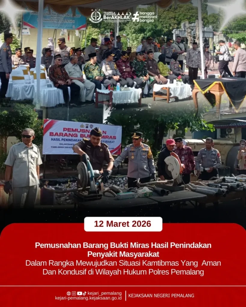 Kejaksaan Negeri Pemalang melalui Kepala Seksi Pemulihan Aset dan Pengelolaan Barang Bukti (PAPBB) Irfan Harisman, S.H., M.H. turut hadir pada kegiatan pemusnahan barang bukti hasil penindakan penyakit masyarakat Tahun 2026 yang diselenggarakan oleh Polres Pemalang pada Kamis, 12 Maret 2026 bertempat di Halaman Mapolres Pemalang. Kegiatan tersebut turut dihadiri oleh Bupati Pemalang, Forkopimda Kabupaten Pemalang, tokoh agama, tokoh masyarakat, serta unsur terkait lainnya sebagai bentuk sinergi dalam menjaga keamanan dan ketertiban masyarakat di wilayah Kabupaten Pemalang. Pemusnahan barang bukti ini merupakan bagian dari hasil kegiatan cipta kondisi dan Operasi Pekat Candi 2026 yang dilaksanakan dalam rangka menciptakan situasi kamtibmas yang aman dan kondusif menjelang serta selama bulan suci Ramadhan hingga pengamanan Idul Fitri 1447 H. Melalui kegiatan ini diharapkan dapat menekan berbagai bentuk penyakit masyarakat serta meningkatkan kesadaran hukum masyarakat demi terwujudnya lingkungan yang tertib, aman, dan nyaman di Kabupaten Pemalang