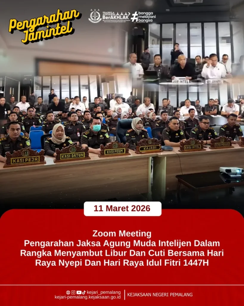 Kepala Kejaksaan Negeri Pemalang Ibu Rina Idawani, S.H., CN., M.M. bersama Jajaran Kasi, Kasubsi, Jaksa Fungsional dan seluruh pegawai Kejaksaan Negeri Pemalang mengikuti kegiatan Pengarahan Jaksa Agung Muda Intelijen secara virtual melalui Zoom Meeting pada Rabu, 11 Maret 2026 bertempat di Aula Kejaksaan Negeri Pemalang. Kegiatan ini membahas kesiapan jajaran Kejaksaan Republik Indonesia dalam menghadapi serta mengantisipasi berbagai situasi menjelang dan setelah cuti bersama hari raya keagamaan.