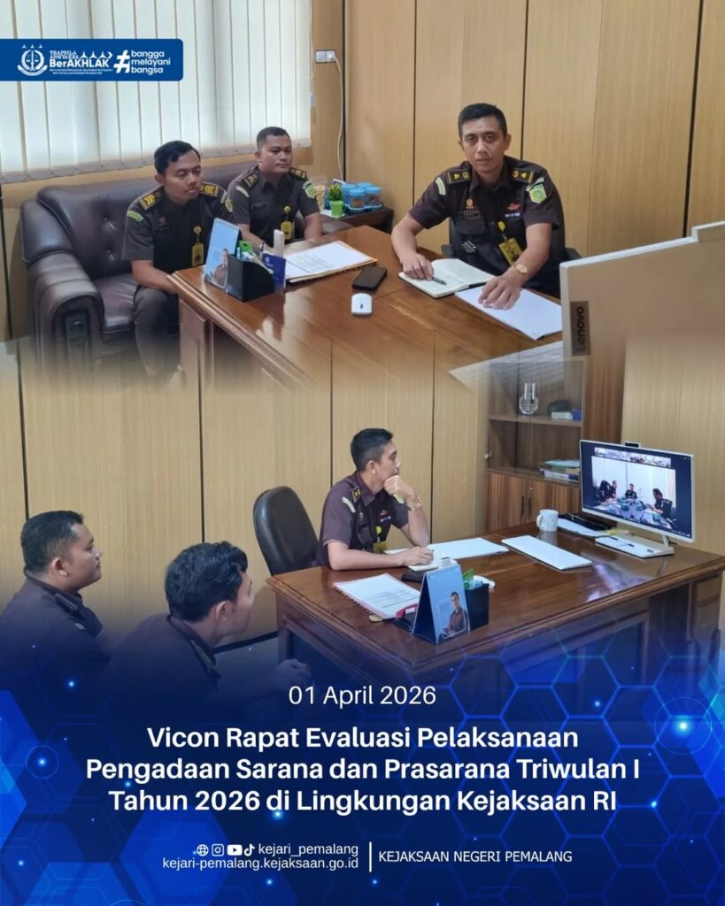 Pada hari Rabu, tanggal 1 April 2026 , bertempat di Ruang Kerja Bidang Pembinaan pada Kejaksaan Negeri Pemalang telah dilaksanakan Rapat Evaluasi Pelaksanaan Pengadaan Sarana dan Prasarana Triwulan I Tahun 2026 di Lingkungan Kejaksaan RI secara daring. Kegiatan tersebut dihadiri oleh Bapak. Andy Listianto, S.H. (Kepala Sub Bagian Pembinaan) dan Staf Bidang Pembinaan.