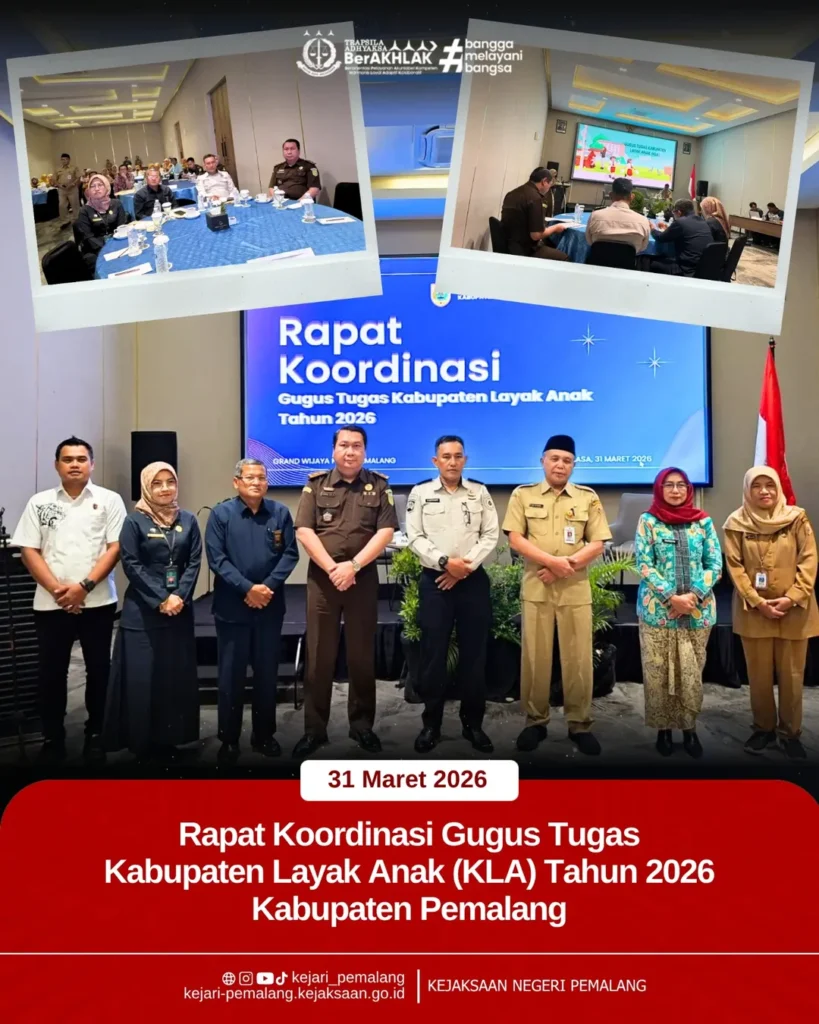 Rapat Koordinasi Gugus Tugas Kabupaten/Kota Layak Anak (GT-KLA) Kejaksaan Negeri Pemalang turut hadir dalam Rapat Koordinasi GT-KLA Kabupaten Pemalang yang dihadiri oleh Bapak. Stirman Priya Eka Samudra, S.H., M.H. (Kepala Seksi Tindak Pidana Umum Kejaksaan Negeri Pemalang) pada Selasa, 31 Maret 2026 di Grand Wijaya Hotel Pemalang. Kegiatan ini membahas evaluasi penyelenggaraan Kabupaten/Kota Layak Anak (KLA) Tahun 2024 sekaligus menyampaikan harapan agar Kabupaten Pemalang pada Tahun 2026 dapat meningkatkan capaian menjadi Kategori Utama dalam penilaian Kabupaten Layak Anak. Melalui koordinasi dan sinergi lintas sektor, diharapkan agar terwujudnya lingkungan yang ramah, aman, dan layak bagi tumbuh kembang anak-anak kita, generasi emas masa depan bangsa.