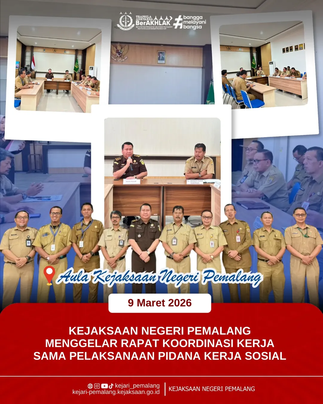 KEJAKSAAN NEGERI PEMALANG MENGGELAR RAPAT KOORDINASI KERJA SAMA PELAKSANAAN PIDANA KERJA SOSIAL Pemalang, Senin (9/3/2026), – Kejaksaan Negeri Pemalang menggelar rapat koordinasi kerja sama pelaksanaan pidana kerja sosial yang bertempat di Aula Kantor Kejaksaan Negeri Pemalang. Pertemuan ini menjadi langkah strategis dalam menyamakan persepsi antar aparat penegak hukum dan Instansi terkait dalam implementasi pidana alternatif non-pemenjaraan sebagaimana diamanatkan dalam KUHP Nasional. Kehadiran lintas institusi ini menegaskan komitmen bersama membangun sistem pemidanaan yang lebih efektif, humanis, dan berorientasi pada pemulihan sosial. Kegiatan dibuka oleh Kepala Seksi Tindak Pidana umum Kejaksaan Negeri Pemalang Bapak. Stirman Eka Priya Samudra, S.H., M.H., yang menekankan urgensi forum koordinasi agar seluruh pihak memiliki pemahaman yang sama terkait mekanisme pelaksanaan pidana kerja sosial. Menurutnya, keseragaman prosedur akan mempermudah implementasi putusan pengadilan di lapangan. Kerja sama ini menjadi ruang kolaboratif dalam mendorong penerapan alternatif pemidanaan selain penjara. Ia menilai pidana kerja sosial mampu memberikan manfaat langsung bagi masyarakat sekaligus membantu proses reintegrasi pelaku.