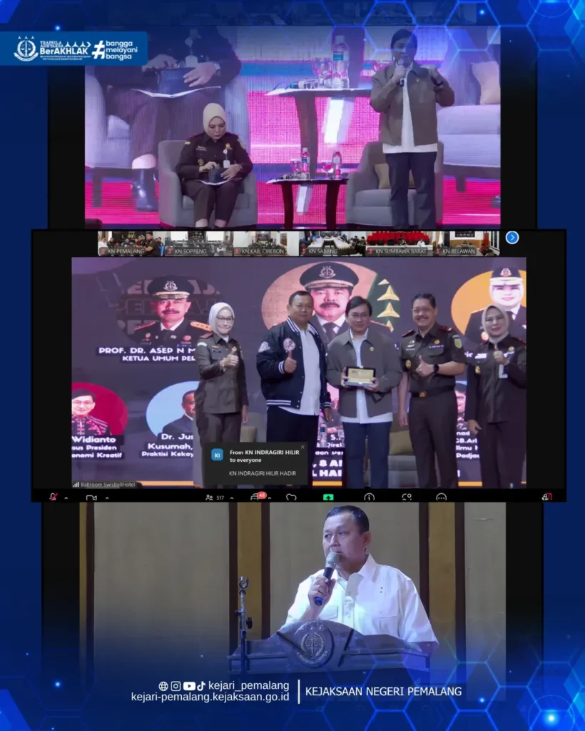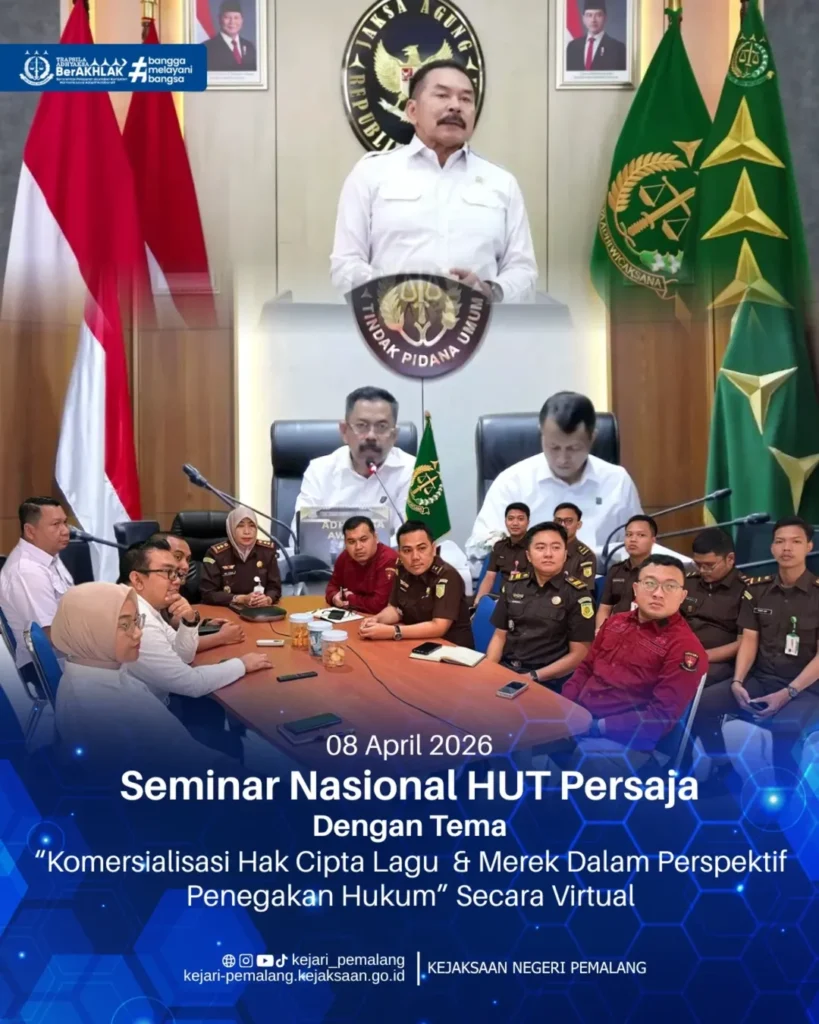 Rabu, 8 April 2026 Kepala Kejaksaan Negeri Pemalang Ibu. Rina Idawani, S.H., CN., M.M. didampingi pejabat struktural beserta Calon Jaksa di Kejaksaan Negeri Pemalang mengikuti Seminar Nasional bertempat di Ruang Vicon Kejaksaan Negeri Pemalang secara virtual. Kegiatan tersebut diselenggarakan oleh Jaksa Agung Muda Tindak Pidana Umum dalam rangka optimalisasi penanganan perkara terkait Hak Kekayaan Intelektual (HKI), dengan mengangkat tema “Komersialisasi Hak Cipta Lagu dan Merek dalam Perspektif Penegakan Hukum”.