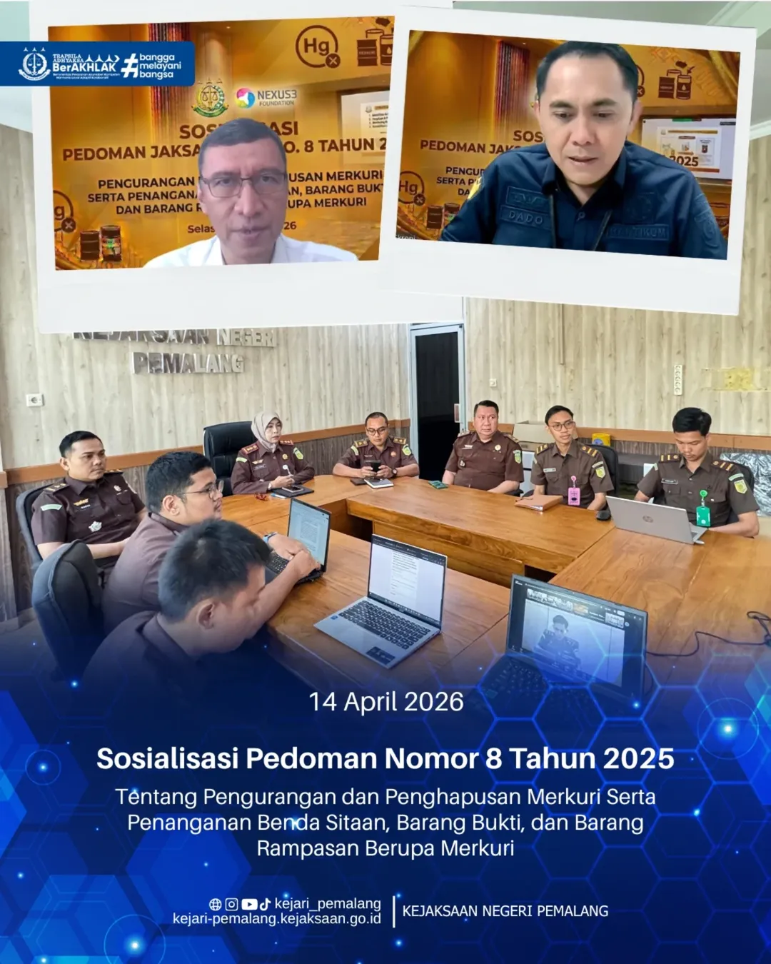 Selasa, 14 April 2026. Kepala Kejaksaan Negeri Pemalang Ibu Rina Idawani, S.H., CN., M.M. beserta Para Kepala Seksi dan staf mengikuti Kegiatan Sosialisasi Pedoman Nomor 8 Tahun 2025 tentang Pengurangan dan Penghapusan Merkuri Serta Penanganan Benda Sitaan, Barang Bukti, dan Barang Rampasan Berupa Merkuri, Bertempat di Ruang Vicon Kejaksaan Negeri Pemalang.