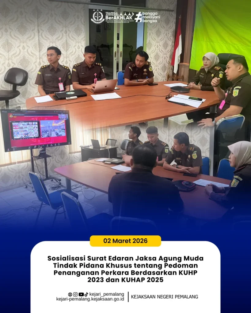 Kepala Kejaksaan Negeri Pemalang Ibu Rina Idawani, S.H., CN., M.M. didampingi oleh Bapak. Fadli Surahman, S.H., M.H. selaku Kepala Seksi Tindak Pidana Khusus beserta jajaran Bidang Tindak Pidana Khusus mengikuti kegiatan Sosialisasi Surat Edaran Jaksa Agung Muda Tindak Pidana Khusus tentang Pedoman Penanganan Perkara Berdasarkan KUHP 2023 dan KUHAP 2025 yang dilaksanakan secara daring melalui Zoom Meeting di Ruang Vicon Kejaksan Negeri Pemalang.