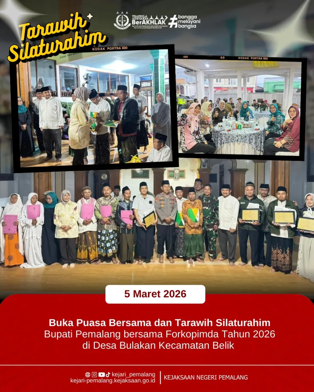 Kepala Kejaksaan Negeri Pemalang Ibu Rina Idawani, S.H., CN., M.M. turut hadir dalam kegiatan Tarawih dan Silaturahim (Tarhim) Bupati Pemalang bersama Forkopimda Tahun 1447 H / 2026 M yang dilaksanakan pada Kamis, 5 Maret 2026 di Masjid Ahlusunah Waljamaah, Desa Bulakan, Kecamatan Belik, Kabupaten Pemalang. Kegiatan yang diselenggarakan oleh Pemerintah Kabupaten Pemalang ini dihadiri oleh Bupati Pemalang Bapak Anom Widiyantoro, S.H., M.M., unsur Forkopimda, para Kepala OPD, Camat Belik, unsur TNI-Polri, para kepala desa se-Kecamatan Belik, serta jamaah masyarakat Desa Bulakan.