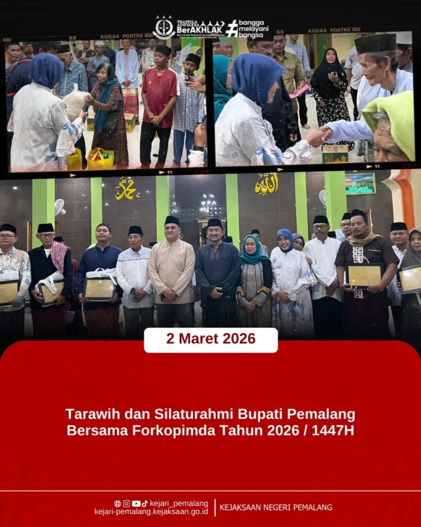 Kepala Kejaksaan Negeri Pemalang Ibu Rina Idawani, S.H., CN., M.M. turut menghadiri kegiatan Tarawih dan Silaturahmi Bupati Pemalang bersama Forkopimda Tahun 2026 / 1447H, bertempat di Masjid Daarut Taqwa Desa Sewaka, Kecamatan Pemalang, Senin 02 Maret 2026.