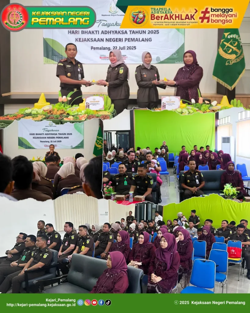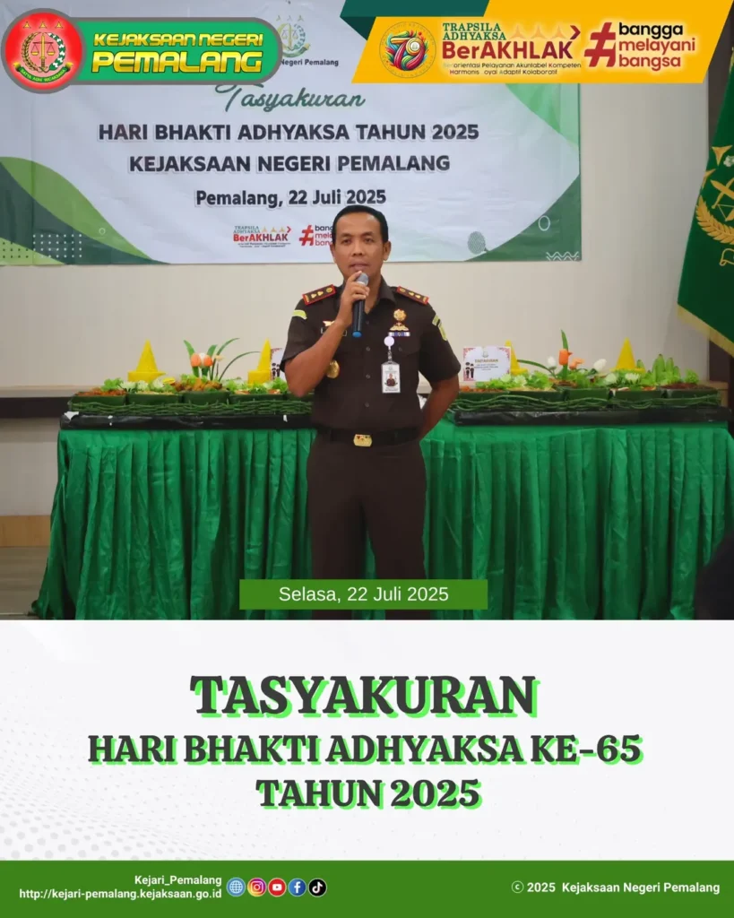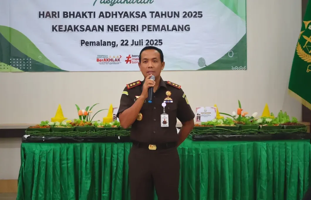 Pemalang – Kejaksaan Negeri Pemalang menggelar tasyakuran dalam rangka Hari Bhakti Adhyaksa ke-65 pada Selasa (22/7/2025) di Aula Kejari Pemalang. Acara diikuti sekitar 90 orang, terdiri dari Kajari Pemalang Muib, S.H., M.H.Li., Ketua IAD Daerah Pemalang Ny. Ratna Muib, para Kasi, Plt. Kasubagbin, Pegawai Kejaksaan Negeri Pemalang, PPNPN, serta anggota IAD.