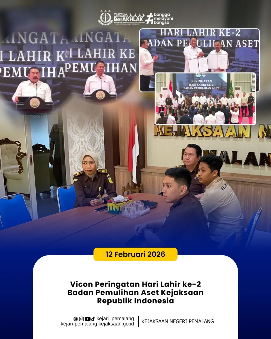 Kejaksaan Negeri Pemalang melalui Stirman Eka Priya Samudra, S.H., M.H. (Kepala Seksi Tindak Pidana Umum) beserta staf Bidang Pemulihan Aset dan Pengelolaan Barang Bukti (PAPBB) mengikuti Vicon Peringatan Hari Lahir Badan Pemulihan Aset Kejaksaan Republik Indonesia yang diselenggarakan secara daring pada Kamis, 12 Februari 2026.