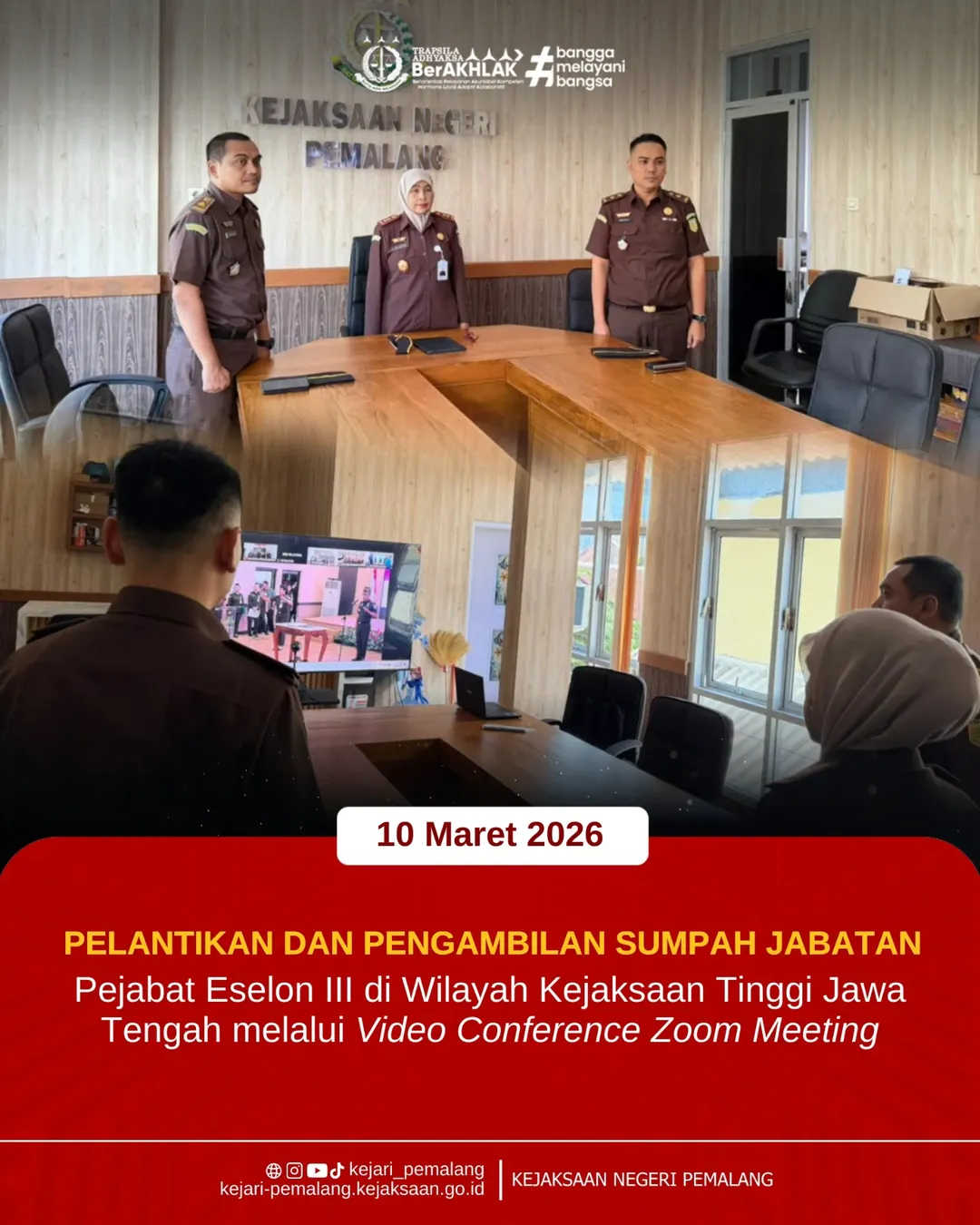 Selasa, 10 Maret 2026, Kepala Kejaksaan Negeri Pemalang, Ibu Rina Idawani, S.H., CN., M.M., didampingi Kepala Seksi Intelijen Bapak. Akhmad Rafliansyah Pasra, S.H., M.H. dan Kepala Seksi Pemulihan Aset dan Pengelolaan Barang Bukti Bapak, Irfan Harisman, S.H., M.H., mengikuti kegiatan Pelantikan dan Pengambilan Sumpah Jabatan Pejabat Eselon III di Wilayah Kejaksaan Tinggi Jawa Tengah yang dilaksanakan secara daring melalui Video Conference Zoom Meeting bertempat di Ruang Vicon Kejaksaan Negeri Pemalang. Pejabat yang dilantik dalam kegiatan tersebut yaitu : 1. Asisten Bidang Pembinaan Kejaksaan Tinggi Jawa Tengah; 2. Asisten Bidang Pengawasan Kejaksaan Tinggi Jawa Tengah; 3. Kepala Kejaksaan Negeri Pati; 4. Kepala Kejaksaan Negeri Klaten; 5. Kepala Kejaksaan Negeri Salatiga